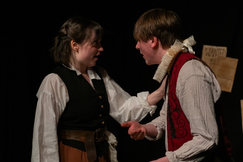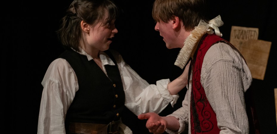 One of the characters with a little more control over the others is Tom, played by Jemima Hurst. Tom, or one of the characters many other pseudonyms, works mysteriously on the docks and is usually found up to no good. Dressed in traditionally masculine clothes, Tom’s character open up questions surrounding cross-dressing and gender in the Tudor period. As common as it was for young men to perform as women on stage, we see the harsh persecution Tom faces for refusing to conform to gender boundaries in the streets. Hurst’s performance is passionate and emotional. The audience flicker between sympathy and disdain towards Tom, as we see try to understand where their real loyalties lie.